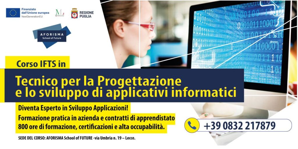 Il percorso in “Tecnico per la Progettazione e lo sviluppo di applicativi informatici” è un percorso realizzato in collaborazione con Weave, Confindustria di Brindisi e di Lecce, IIS Trinchese di Martano, UniSalento. L’obiettivo perseguito è il rilascio di una Qualifica professionale corrispondente al IV Livello EQF, altamente spendibile sul mercato del lavoro e rispondente al […]